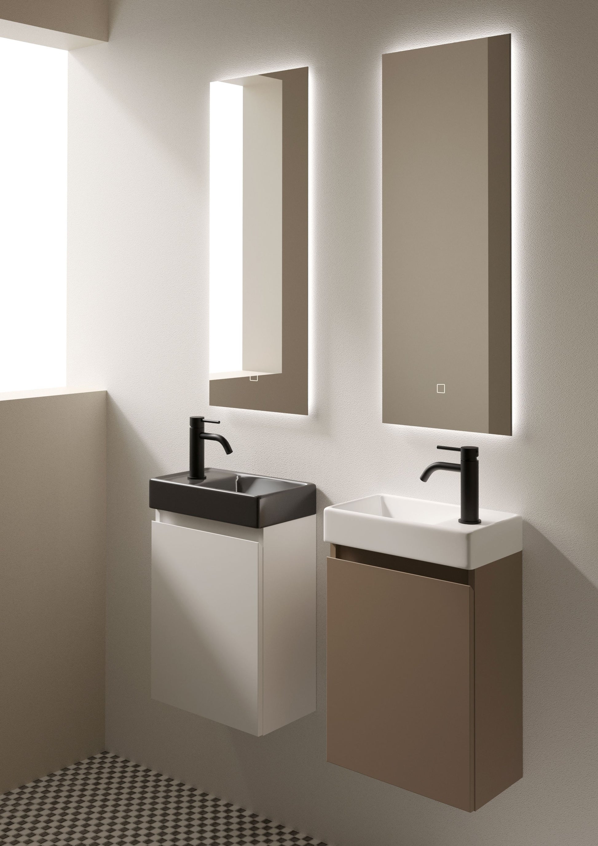 Bris-serien er en smart løsning for små baderom. Skap unike og stilige kombinasjoner ved å mikse og matche mellom tre farger på de kompakte servant skapene og to farger på vaskene. Det moderne speilet med integrert LED-belysning fullfører uttrykket. Stilren minimalisme og plassbesparende funksjonalitet – perfekt selv i de aller minste rommene.