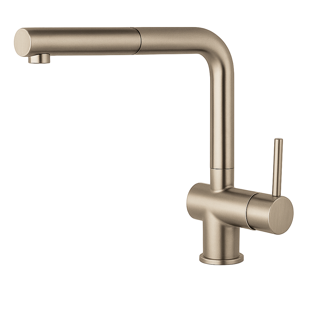 Griper et moderne kjøkkenbatteri med rene linjer og et tidløst uttrykk. Den rette tuten gir en stram og elegant stil, mens uttrekksfunksjonen gjør det enkelt å skylle ned i vasken eller fylle store kar. Et praktisk valg som kombinerer design og funksjonalitet.