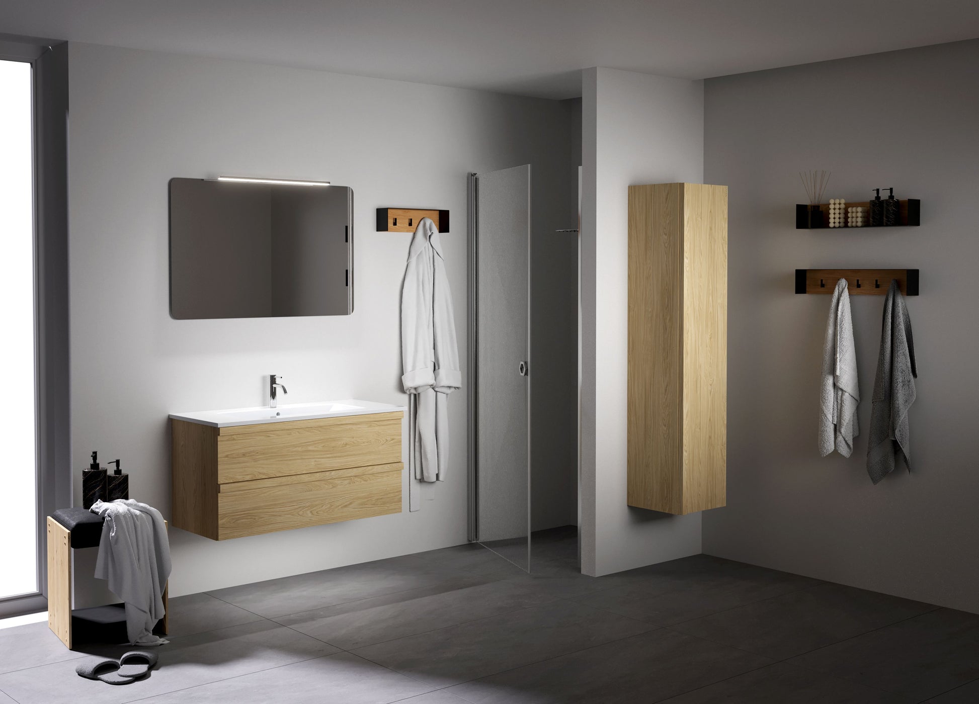 Torden-serien byr på tidløst design og slitesterke overflater. Serien leveres i en lys eikefarge som passer perfekt til nordiske baderom og gir et lunt og naturlig uttrykk.
